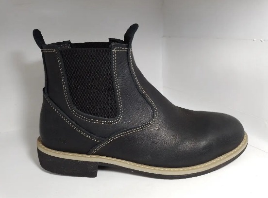 Tipo vira francesa. Cabedal de couro e palmilha de sola.